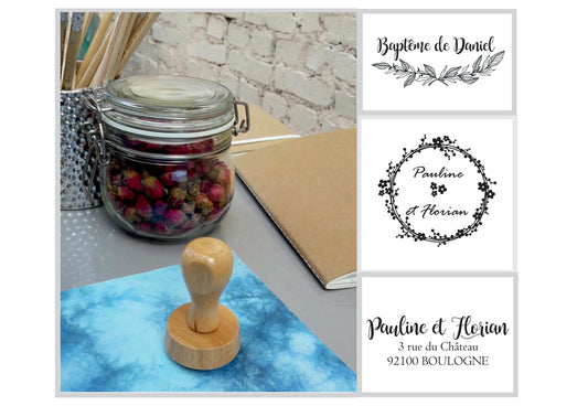 Tampon couronne fleurs A, tampon baptême sur mesure, tampon rond 4,5cm, tampon prénom, tampon date,tampon personnalisé, tampon bois, stamp