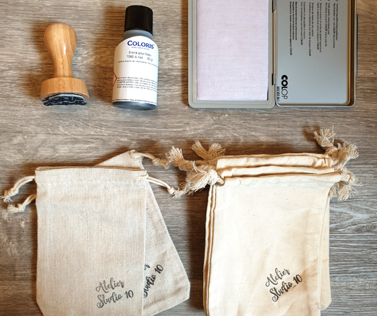 KIT SPECIAL TEXTILE, TAMPON BOIS DE 5 X 5 CM, TAMPON ENCREUR ET ENCRE TEXTILE